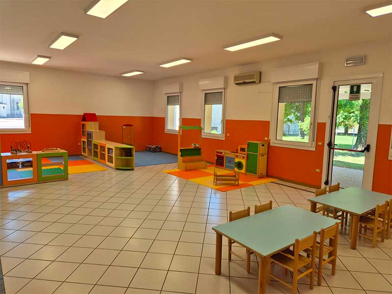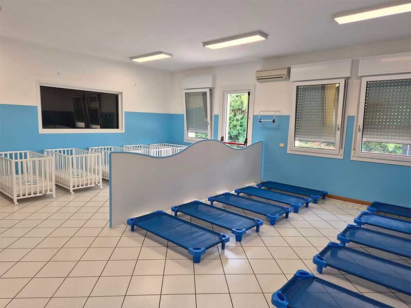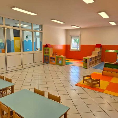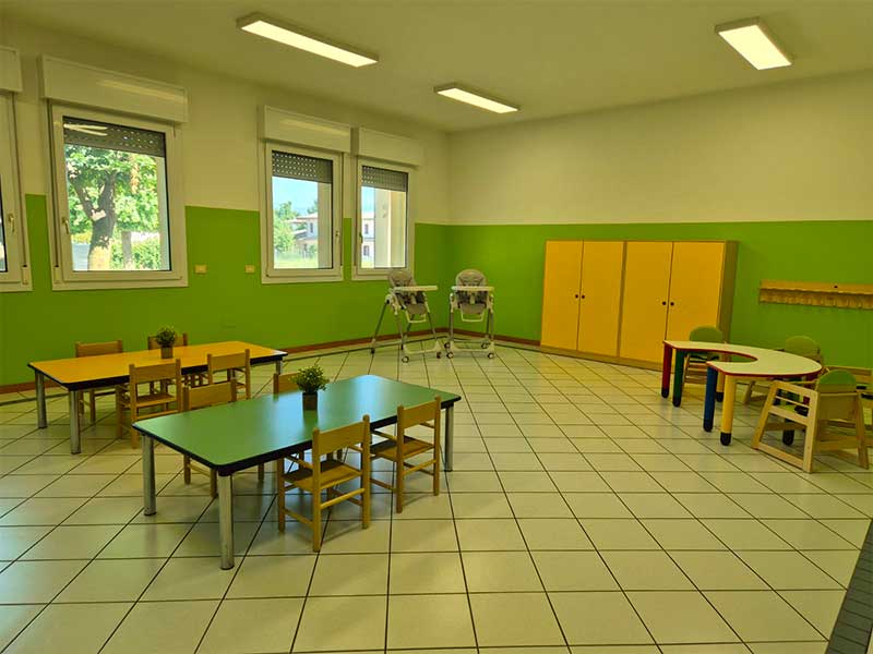 L’asilo nido Il Delfino è strutturato in modo da permettere al bambino di fare e sperimentare diverse attività; ciò grazie alla suddivisione delle stanze in “angoli”, ossia spazi allestiti e organizzati con materiali specifici che hanno lo scopo di stimolare le potenzialità affettive, sociali e cognitive dei bambini. L’asilo è disposto su unico livello di 430 mq.